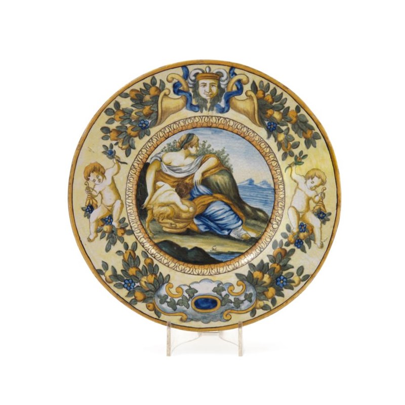 An Italian maiolica charger 19th century, painted in the Castelli manner with a maiden and a faun seated by a grassy knoll with water beyond, within a border of putti and fruiting cornucopia, signed with a monogram, 34.5cm.