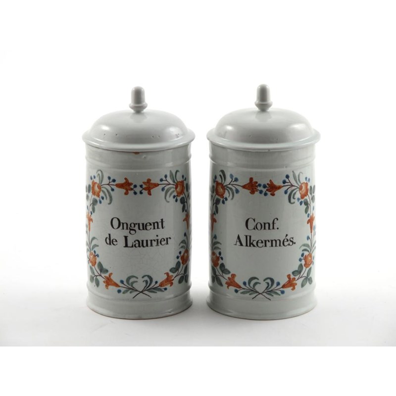 A large pair of French faïence jars and covers 19th century, the cylindrical forms painted with colourful floral garlands, titled 'Conf. Alkermées' and 'Onguent de Laurier', the covers with acorn finials, some good restoration, 29cm. (4)