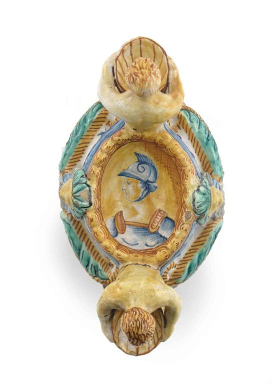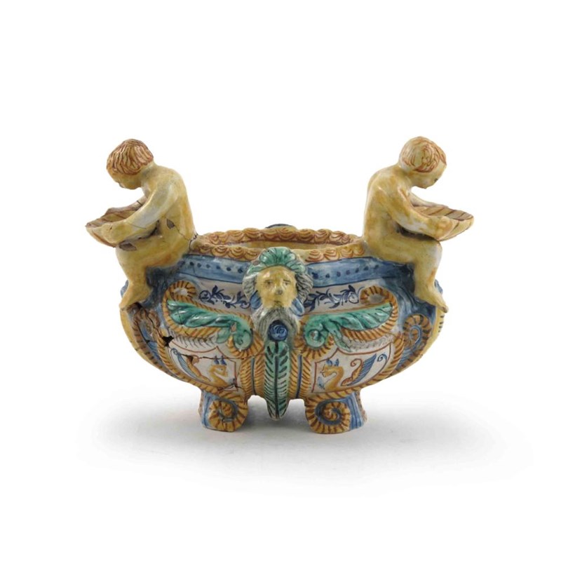 An Italian maiolica salt probably 19th century, of ovoid form, flanked by two seated putti holding baskets, the central well painted with an armoured figure, the long sides with satyr mask handles, damages, 20.5cm.