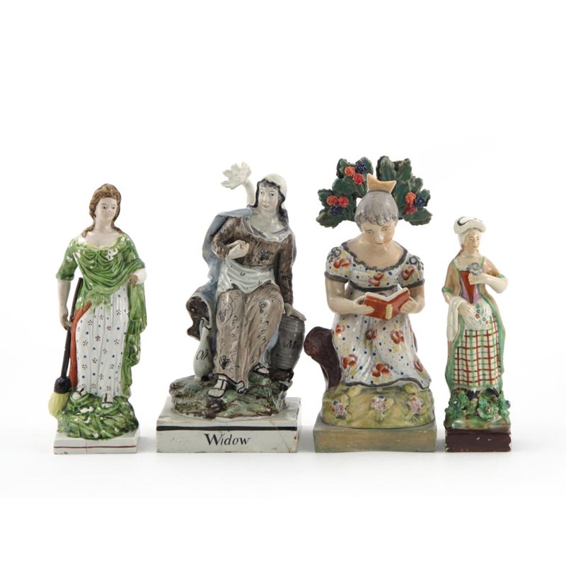 Four pearlware female figures 19th century, one of the Widow seated with a barrel of meal and a jar of oil, one of a young girl reading a book, one holding a broom, the other flowers, damages, 26cm max. (4)