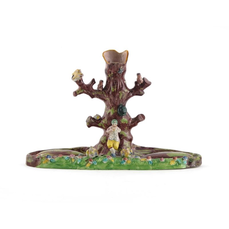 A large Staffordshire pearlware spill vase group 19th century, modelled with the figure of a boy leaning against a hollow tree trunk on which squirrels and birds perch, the figure groups lacking, some damages, 39cm across.