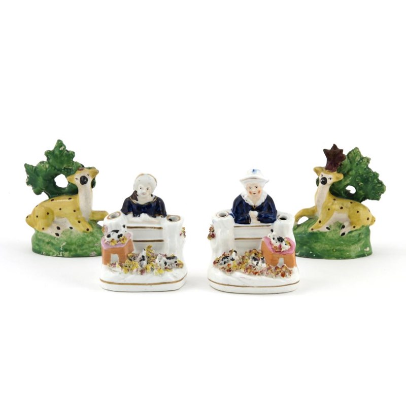 A pair of Staffordshire porcelain quill-holders mid 19th century, modelled as a farmer and his wife leaning on a gate and watching rabbits at play, and a pair of pearlware models of a stag and doe, recumbent before leafy bocage, 10.5cm max. (4)