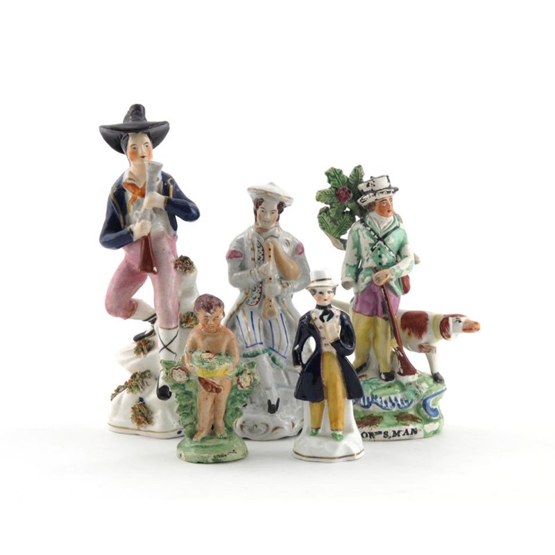 Five Staffordshire figures 19th century, including a pearlware Scottish piper, a putto holding a basket, a pearlware sportsman, a figure with a blunderbuss, and a porcelain figure in a frock coat, damages, 22cm max. (5)