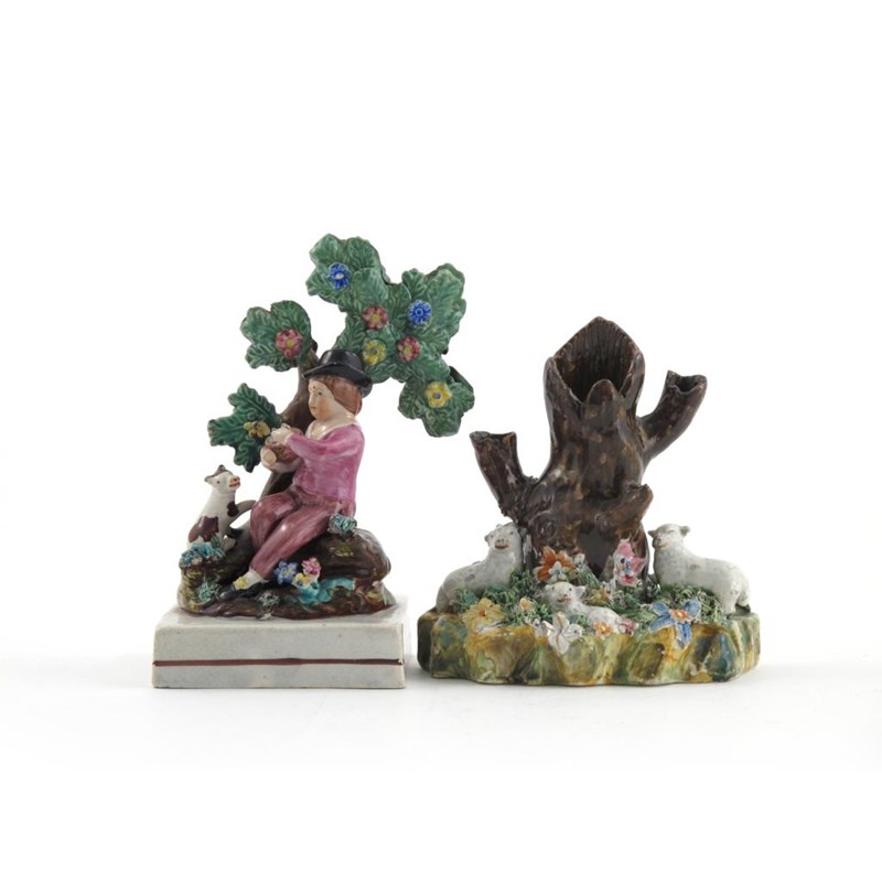 Two pearlware figure groups 19th century, one of a boy holding a bird's nest beneath a flowering tree, possibly emblematic of Spring, the other a spill vase group of a family of sheep beneath a hollow tree trunk, some restoration, 15.5cm max. (2)