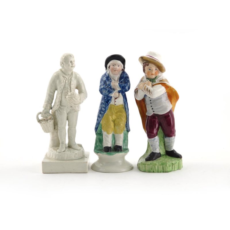 Two Staffordshire figures of Winter, personified as young boys huddling into their clothes, and a white-glazed figure of Spring, holding a basket of flowers and a bird's nest, some restoration, 16cm max. (3)