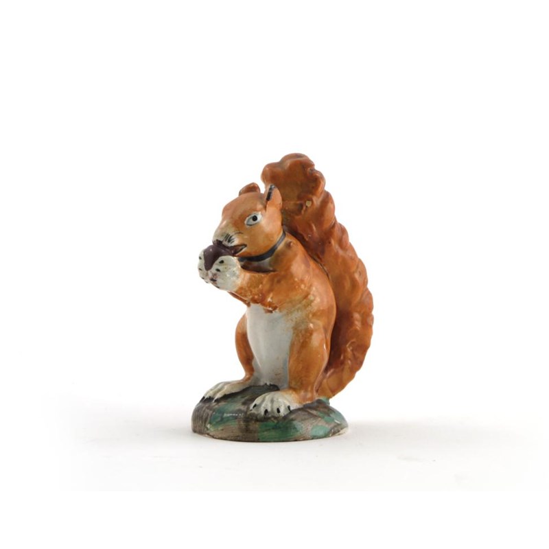 A pearlware model of a red squirrel 1st half 19th century, after Derby, eating a nut which it clutches in its forepaws, and raised on a low grassy base, 8cm.