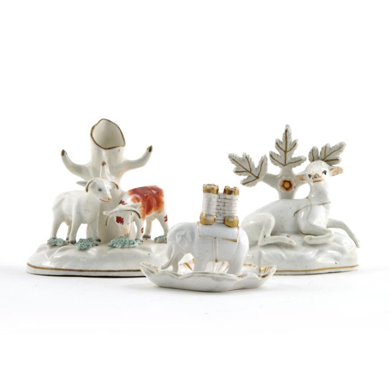 Three Staffordshire porcelain groups 1st half 19th century, one modelled as two cows beneath a spill formed as a tree trunk, one of a deer recumbent beneath bocage, the last of an elephant standing four square on a shaped dish with a castle on his back, some restoration, 11cm max. (3)