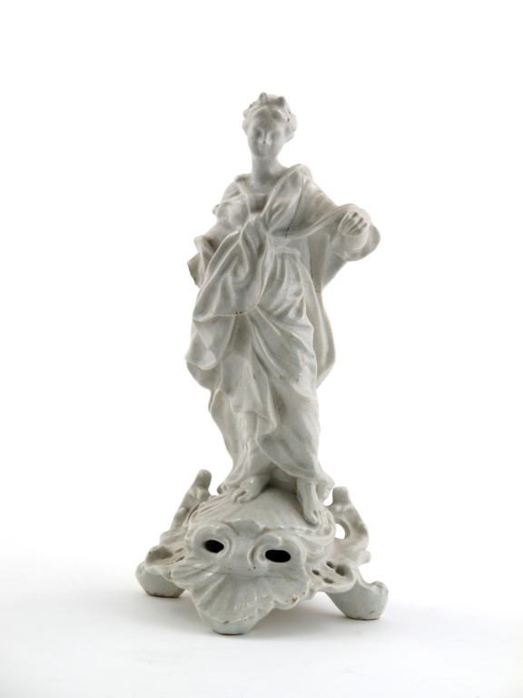A pottery white-glazed figure of Justice late 18th / early 19th century, after Derby, standing on a tall rococo scrolling base, glazed in white, one arm, her sword and scales lacking, 33.2cm.