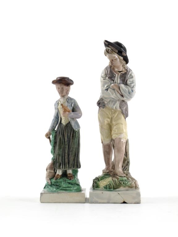 A Ralph Wood figure of a boy c.1790, standing with arms crossed over his chest and wearing a sullen expression, and a pearlware figure of a lady in Ralph Wood style, holding a bird in her left hand, a dog by her side, the former extensively damaged, 24cm max. (2)