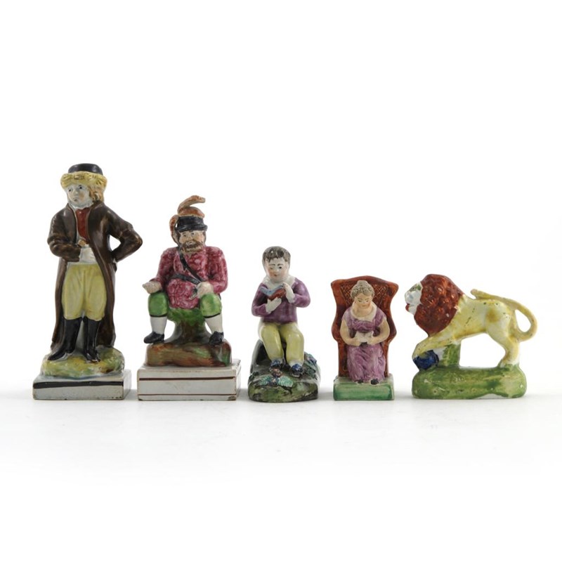 Five small Staffordshire pearlware figures 19th century, two of children reading, one of Falstaff seated on a grassy stump, one of Winter, wearing a furry hat and a long cloak, the last of a lion resting a forepaw on a blue ball, some restoration, 14.5cm max. (5)