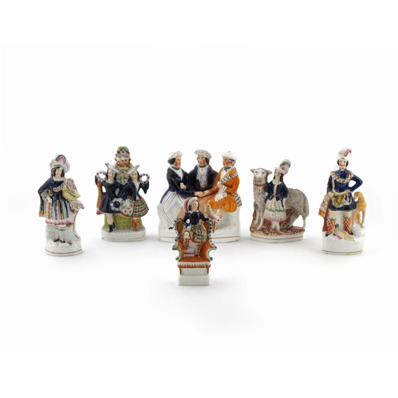 Six Staffordshire Highland groups 19th century, one of Auld Lang Syne with three drinkers sat around a table, the others of dancers and other figures in Highland dress with flowers, birds and animals, 24cm max. (6)