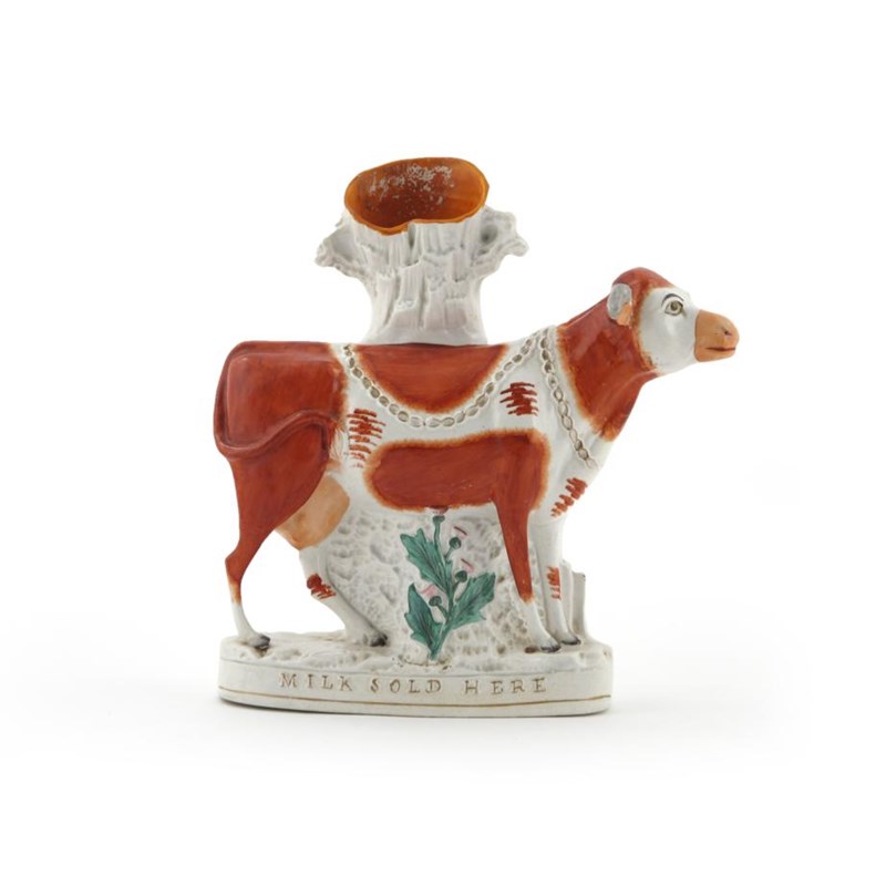 A rare and large Staffordshire advertising spill vase 19th century, modelled as a red and white heifer standing before a hollow tree trunk with thistle growing up beneath, the base titled 'Milk Sold Here', 36cm high.