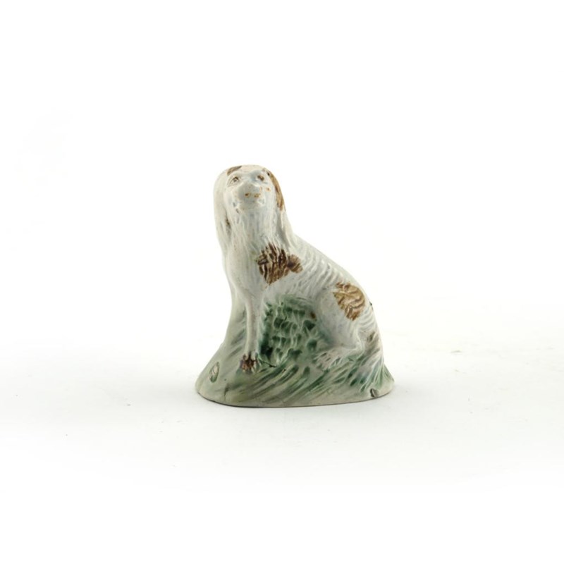 A Pratt ware model of a dog c.1800, seated on its haunches with its head turned to sinister, its coat decorated with patches of a muddy brown, raised on a grassy base, good restoration to the base, 8.2cm.