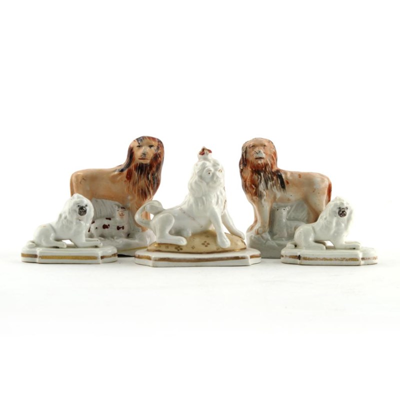 A pair of Staffordshire lion and lamb groups 1st half 19th century, two small Staffordshire porcelain models of recumbent lions, and a porcelain model of a lion seated on a cushion and wearing a coronet, 9.2cm max. (5)