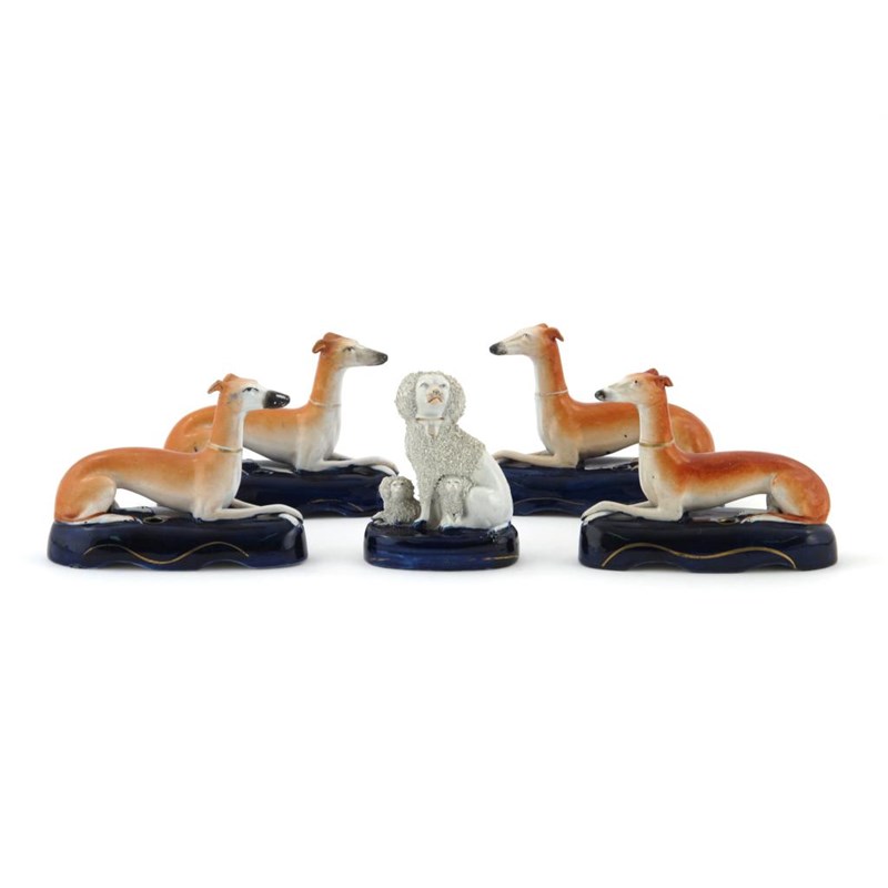 Two pairs of Staffordshire greyhound inkwells 1st half 19th century, recumbent with forepaws crossed over blue oval cushions, and a Staffordshire model of a poodle and two puppies, faults to some, 16.5cm max. (5)