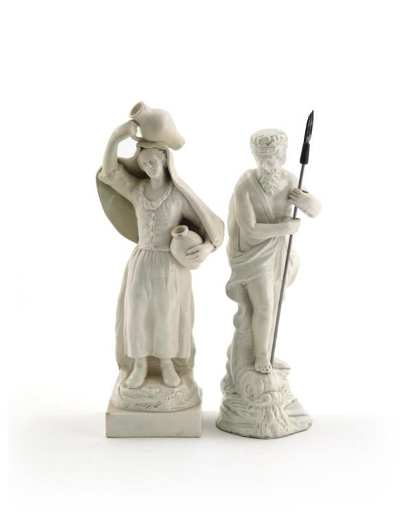 Two Ralph Wood pearlware figures late 19th century, one of Neptune, resting his foot on the head of a dolphin and holding a replacement metal trident, the other of a water carrier, resting a handled urn on her cloaked head, another resting on one hip, some restoration, 24cm max. (2)