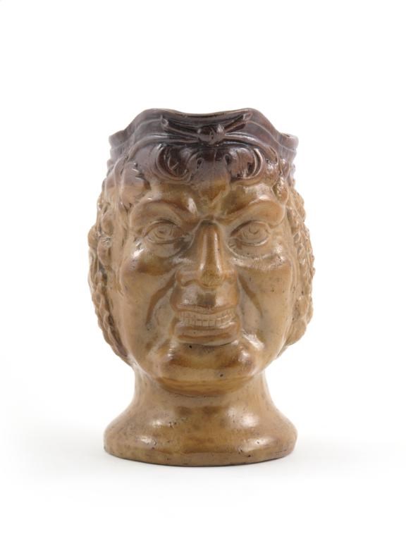 A large brown stoneware mask jug 19th century, modelled as Bacchus with fruiting vine and ears of corn around his head, 24cm high.