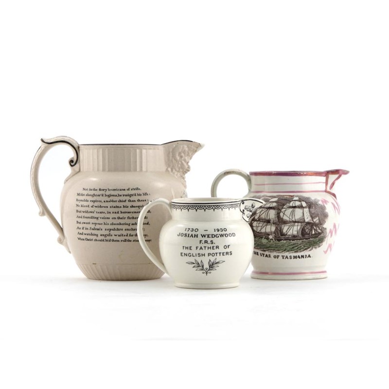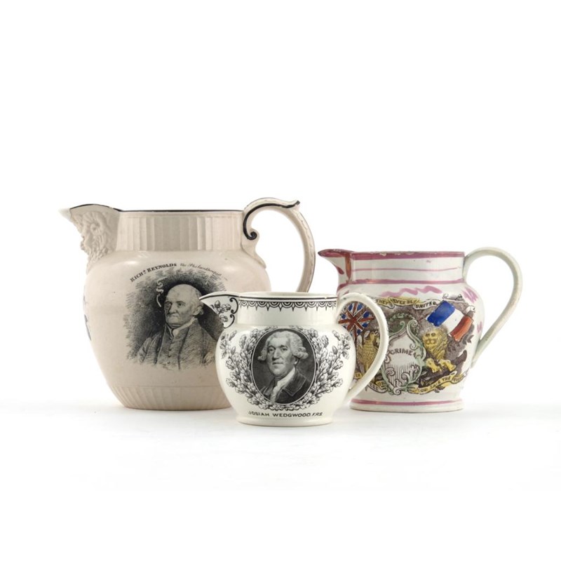 Three pearlware jugs early 19th century and later, one printed with a portrait of the Quaker and philanthropist, Richard Reynolds, the reverse with a stanza mourning his demise, one a Sunderland lustre jug of Crimean interest, the last a Wedgwood commemorative jug for the bicentenary in 1930, some small faults, 16cm high max. (3)
