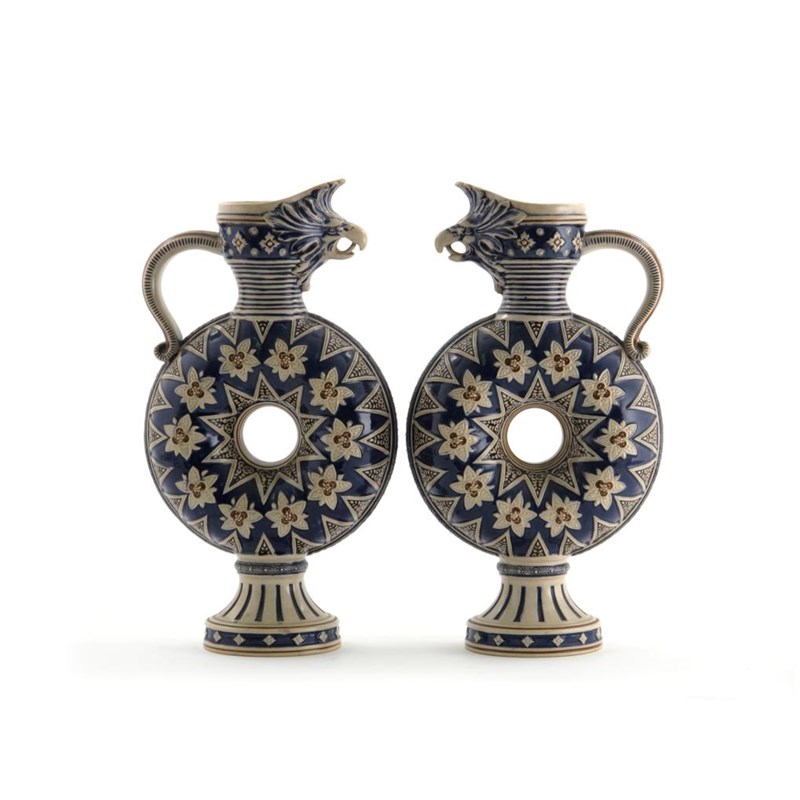 A large pair of Merkelbach and Wick stoneware ewers late 19th century, in the Renaissance manner, the flat circular bodies with a central hole, the spouts with griffin masks, enamelled in blue and brown, impressed mark to one, some faults, 37cm. (2)
