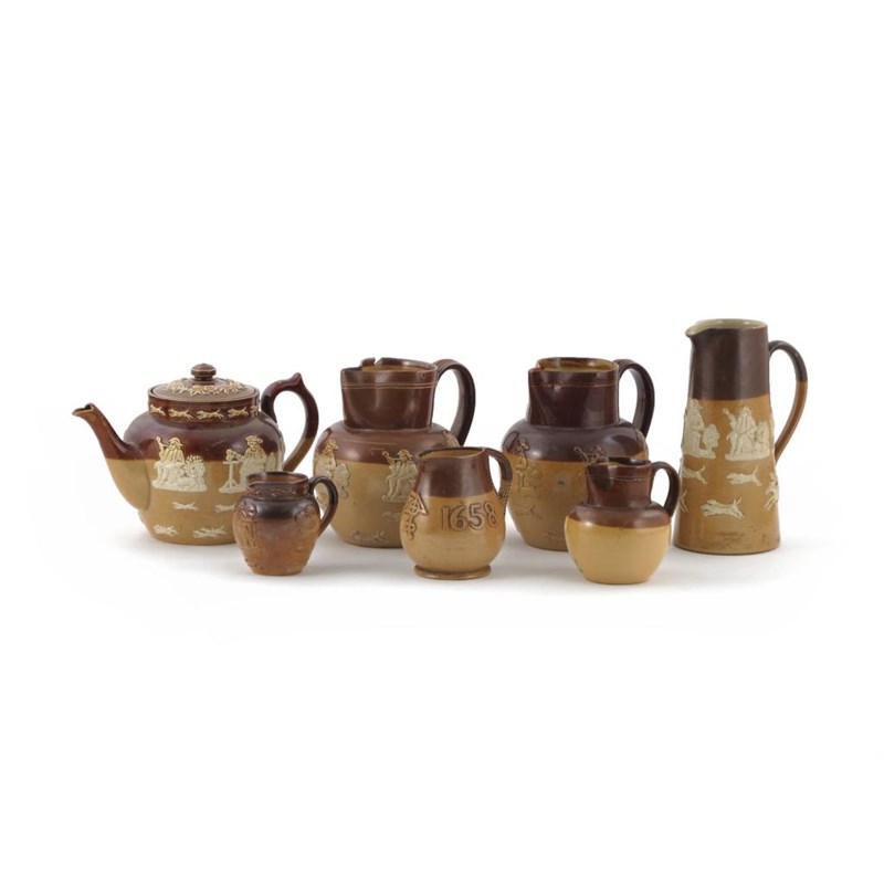 A small collection of Doulton Lambeth and Royal Doulton stoneware late 19th/early 20th century, variously sprigged with hunting scenes, windmills and topers, some faults, 25cm max. Comprising: five jugs, a teapot and cover, and a Salisbury Gill Pot inscribed 'RSM 1658' and made only for Watson & Co. in Salisbury. (8)