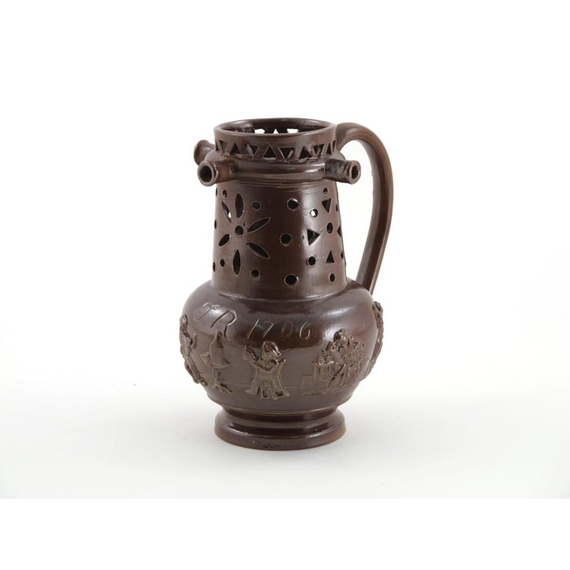 A brown stoneware puzzle jug 19th century, after Nottingham, applied with topers and incised 'J R 1706', the neck and rim pierced with an arrangement of holes, some good restoration, 23.5cm.