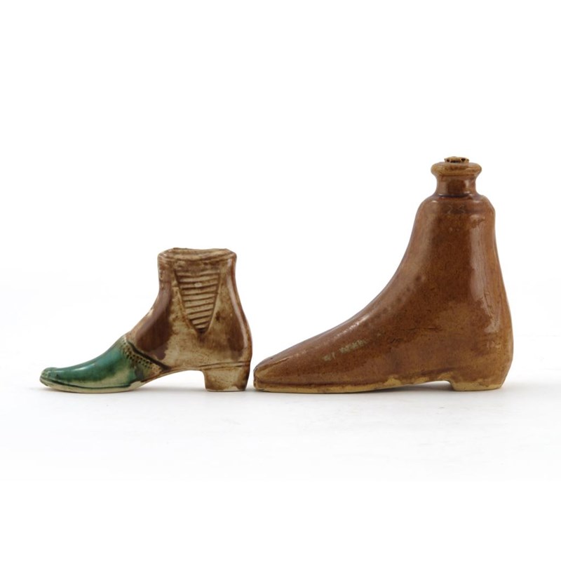 Two stoneware boots 19th century, the larger a flask decorated in a warm treacle glaze, the smaller a moneybox with Whieldon type colours washed in green and brown, 16.5cm max. (2)