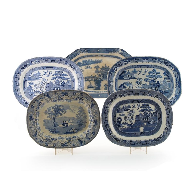 Five blue and white transferware meat platters 19th century, variously decorated with Chinese pagoda patterns and European figures in a landscape, some faults, 48cm max. (5)