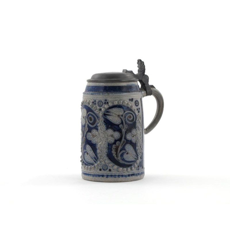 A Westerwald stoneware tankard early 18th century, incised with three panels of a tulip design, enamelled in blue and purple on a grey ground, fitted with a later metal hinged lid, 20.5cm.