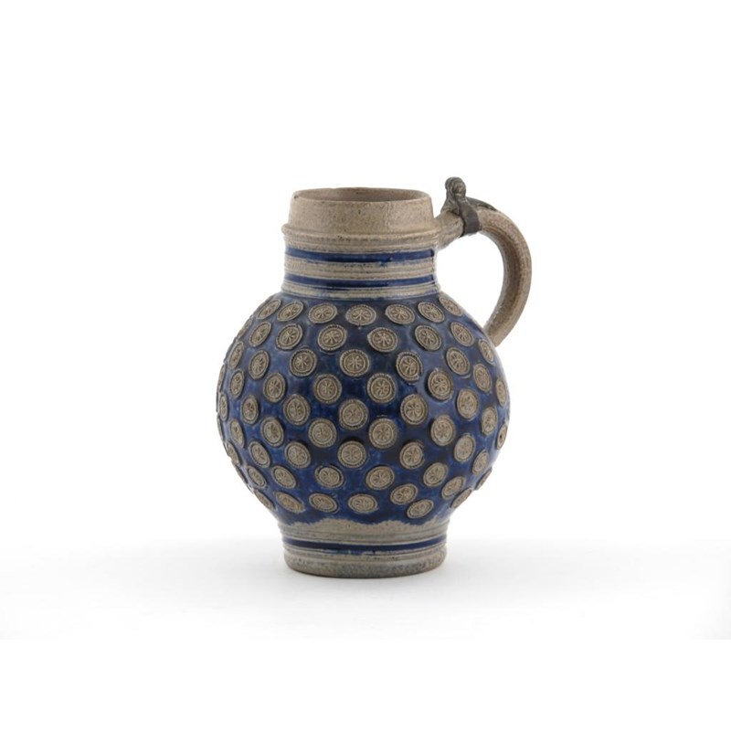 A Westerwald stoneware jug late 18th/early 19th century, the round-bellied body applied with small flowerhead roundels on a deep blue ground, the handle with the remains of a pewter mount, cracked, traces of an old paper label to the base, 21cm.