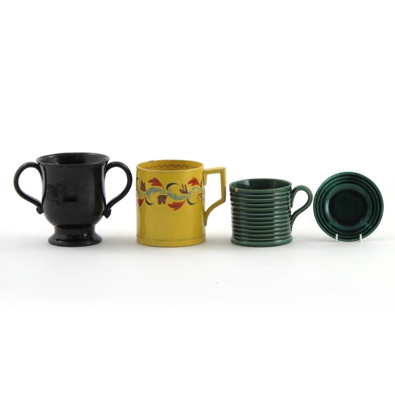 A Jackfield loving cup mid 18th century, the bell-shaped body with twin handles, a yellow-glazed pearlware mug with a bright stylized leafy border, and a green-glazed creamware mug and stand moulded with ribs, minor damages, 10cm high max. (4)