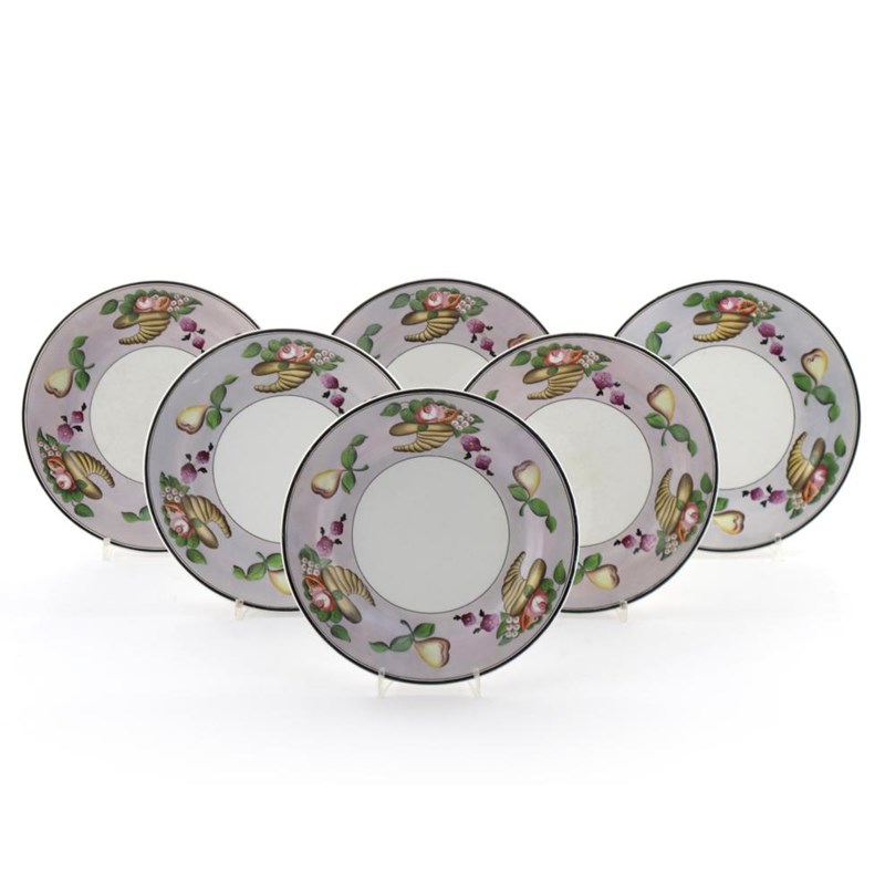 Six Wedgwood creamware plates c.1810-20, decorated with flowering cornucopia and leafy pears on a pale lilac ground, impressed marks, 20.2cm. (6)
