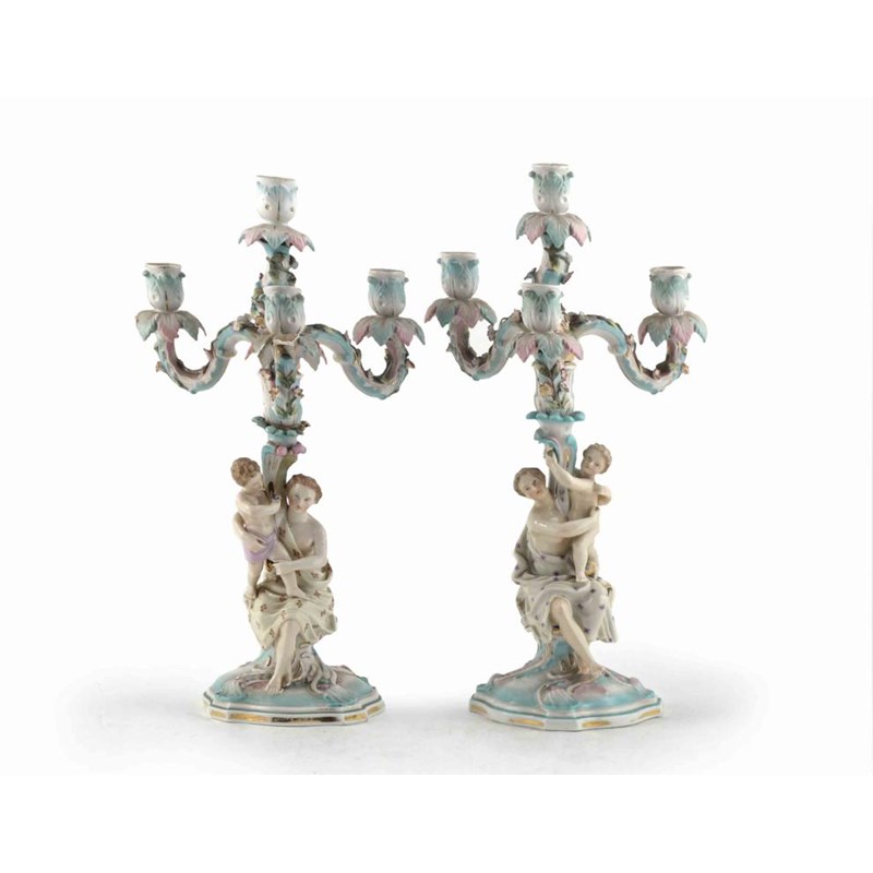 A pair of Continental porcelain candelabra late 19th century, each modelled with a putto standing on the lap of a maiden and supporting the central branch, the upper branches applied with flowers, damages and restoration, 46cm. (2)
