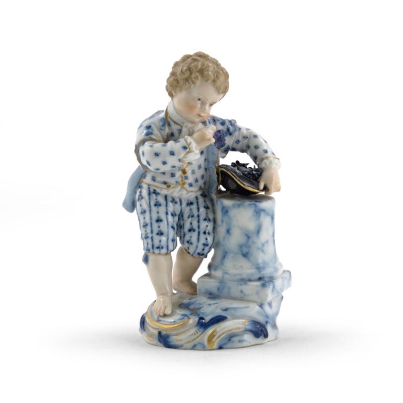 A Meissen figure of a boy 19th century, standing barefoot beside a plinth on which rests his hat filled with grapes, highlighted in blue and gilt, blue crossed swords mark and impressed 107, 12cm.