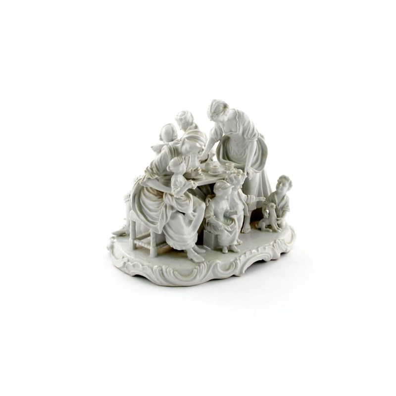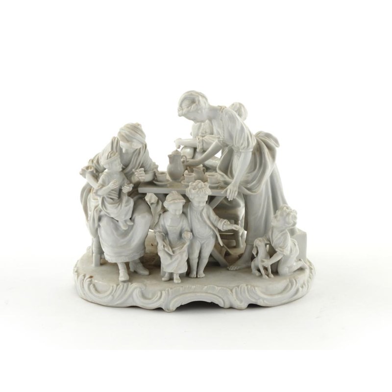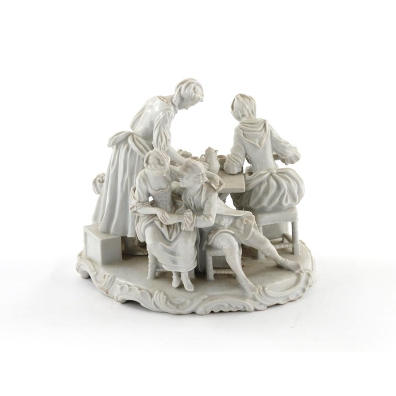 A Ludwigsburg white-glazed figural group 19th century, one side with a couple courting, the other with children playing beneath a tea table while a barefoot maiden reaches for the teapot above, blue crowned CC mark, 19.5cm high.