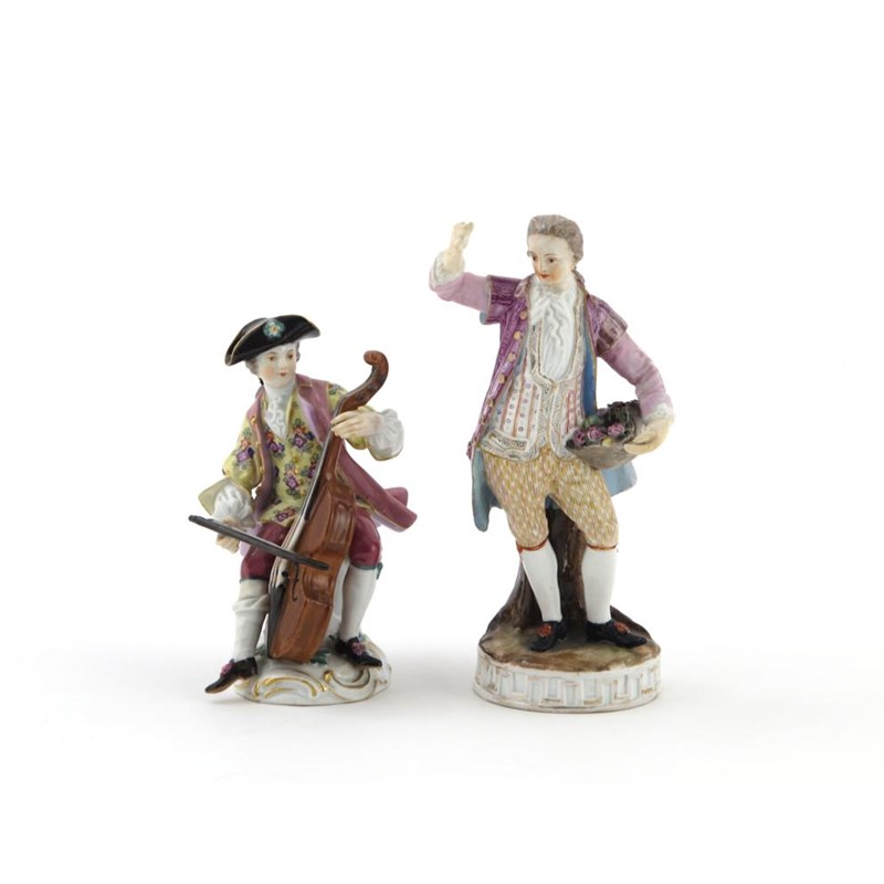 A Meissen model of a cellist 20th century, seated with his instrument and drawing a bow across the strings, and a 19th century Meissen model of a gardener carrying a hat full of pink roses, blue crossed swords marks, restoration to the latter, 16cm max. (2)
