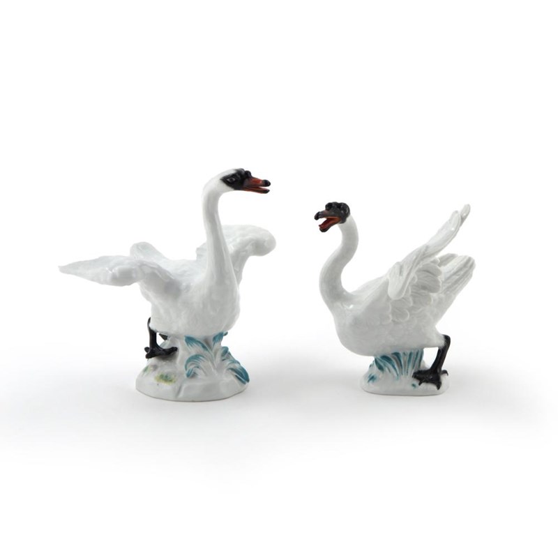 A pair of Meissen models of swans 20th century, after J. J. Kändler, with beaks agape and outstretched wings, raised on bases detailed with reeds, blue crossed swords marks, 14cm max. (2)