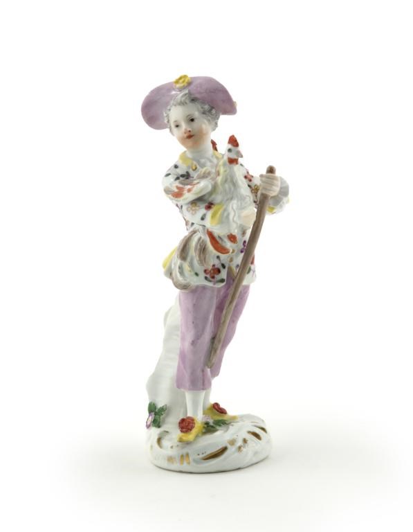 A Meissen pastoral figure of a boy c.1760, holding a cockerel under his right arm, a wooden staff in his left, wearing a floral patterned coat, blue crossed swords mark to the back of the base, broken through his left wrist and restuck, 15cm.