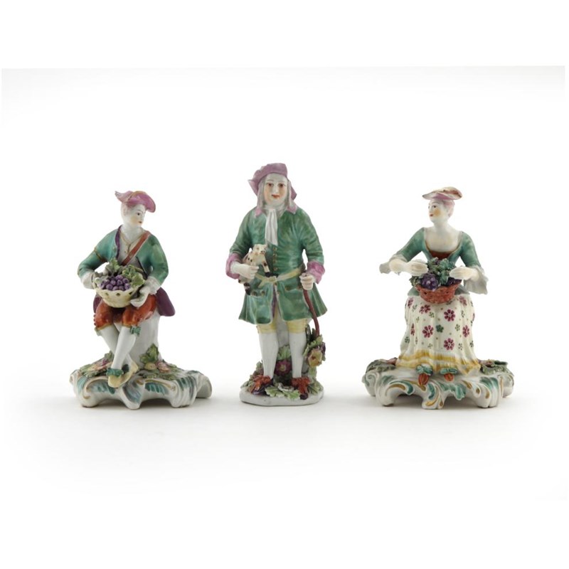 A pair of Derby figures of the Grape-Sellers c.1765, seated with baskets of fruit resting in their laps, and a Derby figure of a farmer holding a pig, taken from the Tithe Pig Group, raised on a low pad base, small damages, 15cm max. (3)