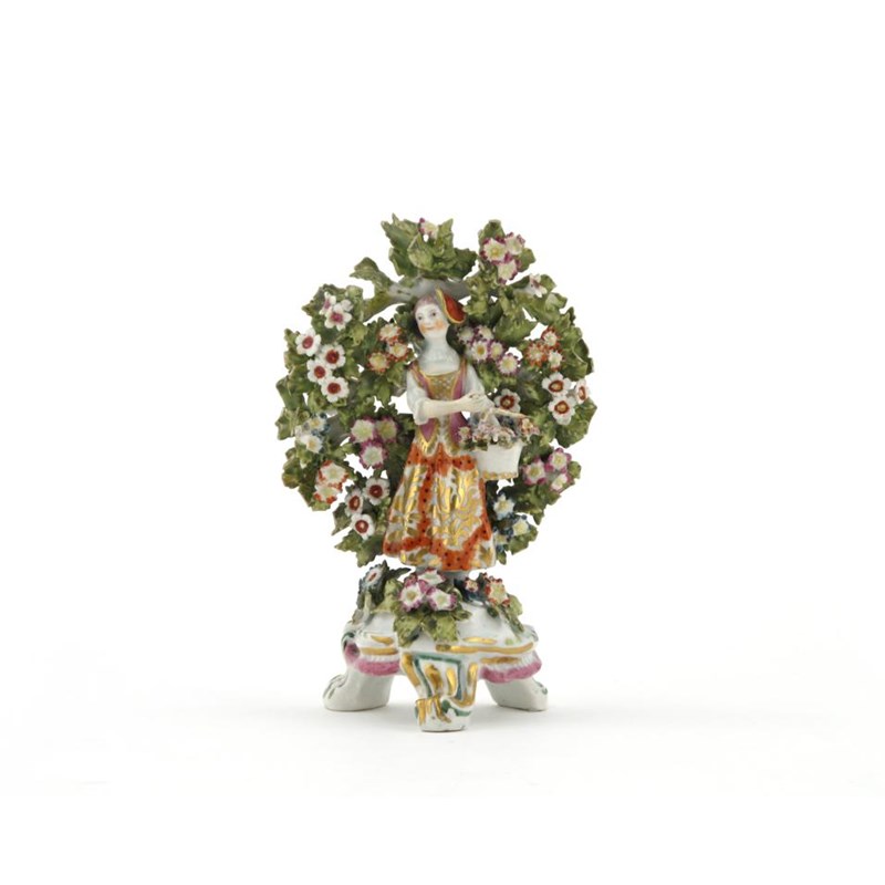 A Bow miniature figure of a gardener's companion c.1765-70, holding a basket of flowers and standing before tall flowering bocage, raised on a high tripod base, red anchor and dagger mark to the reverse, her right arm restored, 16.5cm.