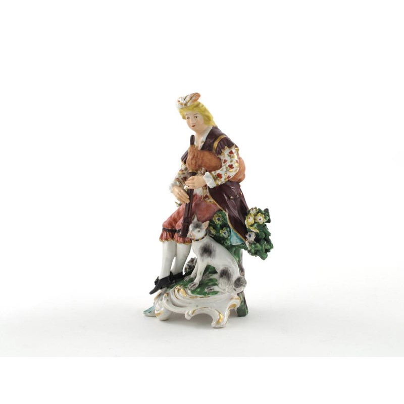 A Derby figure of a piper shepherd c.1775-80, seated on a flowering stump, his bagpipes tucked under one arm, his dog seated by his side on a scrolled base, incised 'No. 301' and further incised marks, some faults, 18cm.