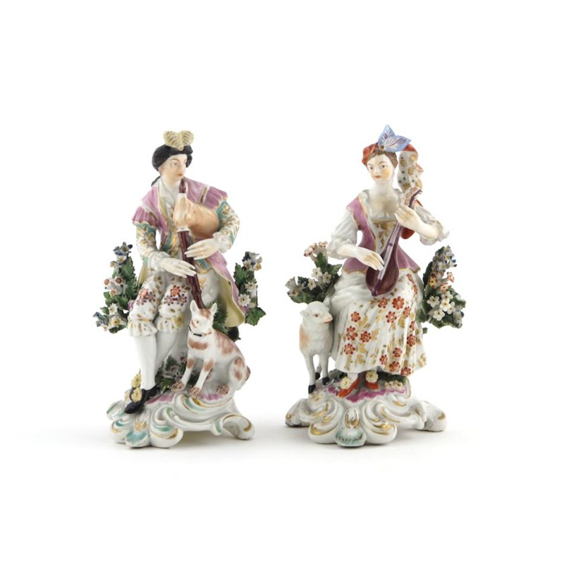 A near pair of Derby figures of a shepherd and shepherdess c.1765, seated on flowering stumps with a dog and a lamb by their sides, he playing the bagpipes, she the mandolin, some faults, 19cm. (2)