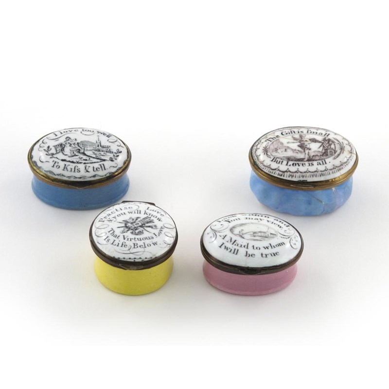 Four Bilston enamel patch boxes late 18th/early 19th century, variously printed with courting lovers, Cupid, and a landscape scene between inscriptions including 'Practise Love & you will know The Virtuous Love Is Life Below', and 'I love too well to Kiss and Tell', the bases coloured yellow, pink and blue, all with mirrored interiors, some faults, 4.5cm max. (4)