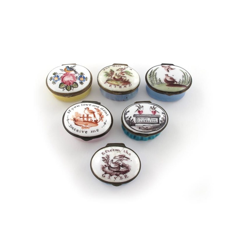 Six enamel patch boxes early 19th century, variously painted with birds in nests, and perched on flowers, fences or signs, titled with mottoes including 'If you love me don't Deceive me', 'Esteem the Giver' and 'A Trifle from Cambridge', five with mirrors to the interior, some restoration, 4.2cm max. (6)