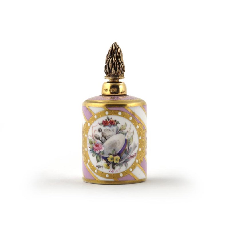 A Lynton porcelain scent bottle late 20th century, painted by Stefan Nowacki with a panel of musical motifs and flowers within a gilt and jewelled rim on a pink and white spiral twist ground, marked for Aspreys, with silver gilt mounts hallmarked for 1997, 6.5cm.