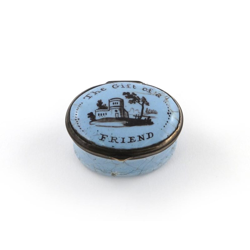 An enamel patch box late 18th century, painted in black with a landscape scene and titled 'The Gift of a Friend' on a pale blue ground, the interior fitted with a mirror, cracks to the enamel, 3.7cm.