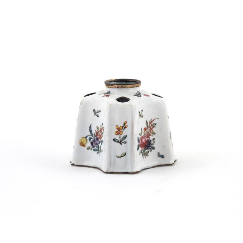 A South Staffordshire enamel inkwell c.1770, of chamfered square form, painted with polychrome sprays of flowers and single stems on a white ground, the top with four small holes around a central metal-mounted hole, 4.3cm high.