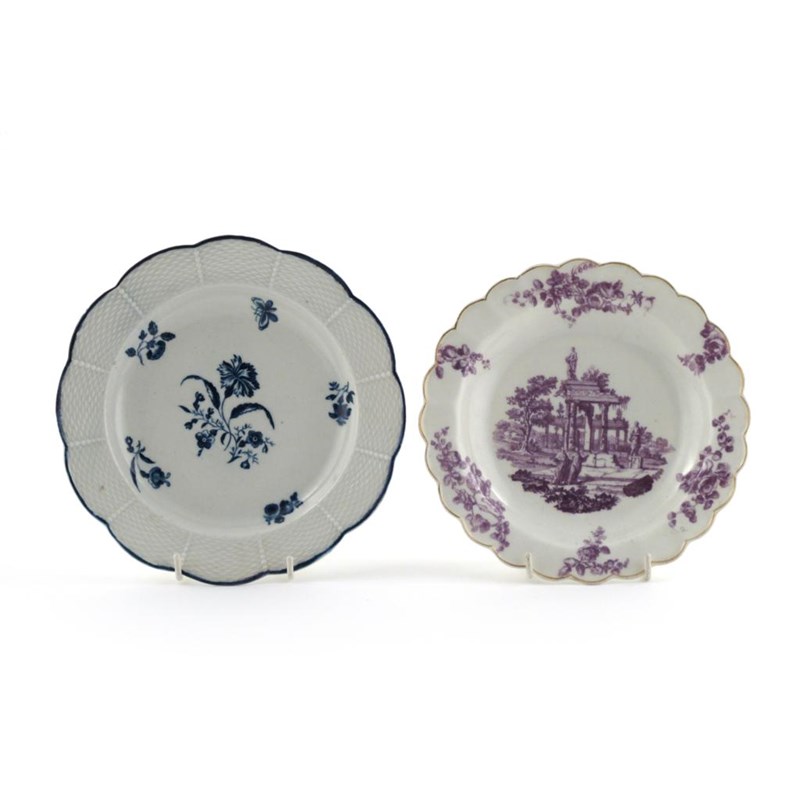Two Worcester scallop-edged plates c.1775-80, one printed in puce with two Classical scholars conversing before ruins, the other with the Gillyflower pattern, hatched crescent mark, 20.7cm. (2)