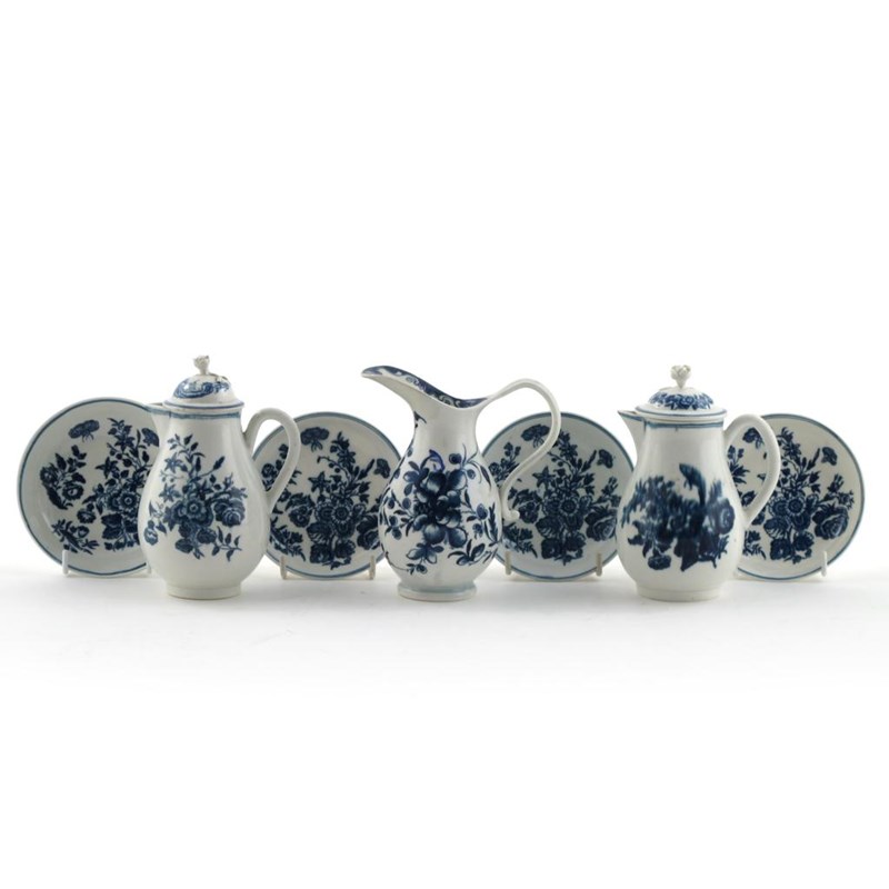 Two Worcester milk jugs and associated covers c.1775, and four Worcester and Caughley saucers, all printed with naturalistic floral patterns, and a Worcester milk jug with a helmet-shape painted with the Mansfield pattern, some faults, 13.5cm max. (9)