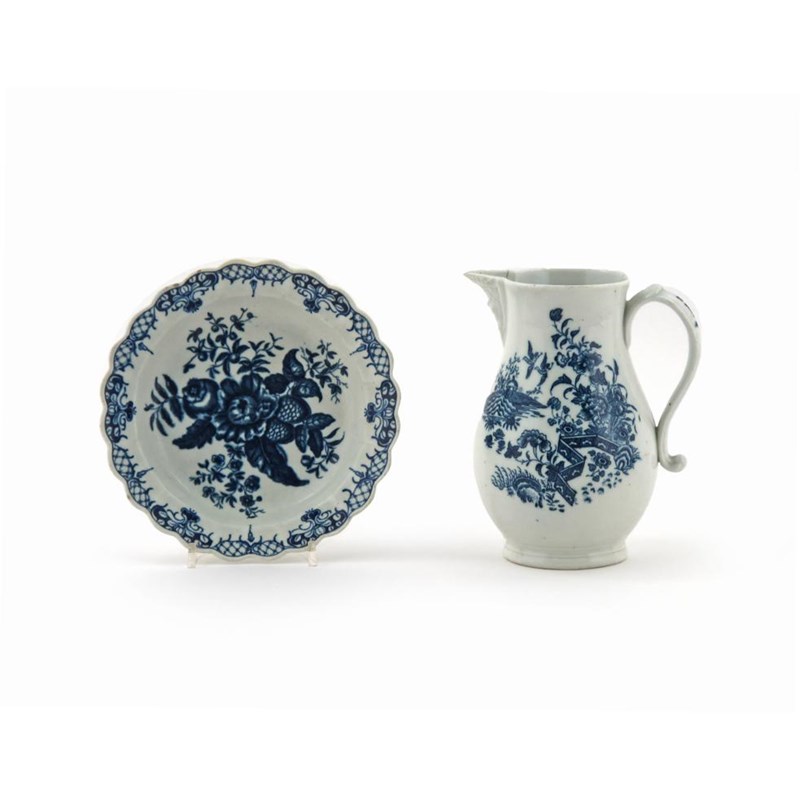 A Worcester blue and white scallop-edged plate c.1775, printed with the Pinecone pattern, and a Caughley jug printed with a Fence pattern, open crescent and C marks, some damage to the jug's spout, 18.5cm max. (2)