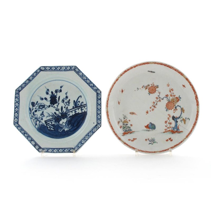 Two Bow plates c.1755-60, one painted in the Kakiemon palette with the Two Quail pattern, the other octagonal and painted in blue on white with prunus and peony in a fenced landscape, hairline crack to one, 20cm max. (2)